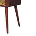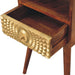 - Eden Mini Nightstand - This Eden Mini Nightstand is made of solid mango wood, with a chestnut finish structure. It has 1 drawer and 1 open shelf for convenient storage space and ample space on top to display a photo frame, candle or lamp. Additionally, the exquisite craftsmanship and beautiful gold brass sheet provide a beautiful carved pattern on the drawer front making this an all-round eye-catching piece of furniture in your bedroom