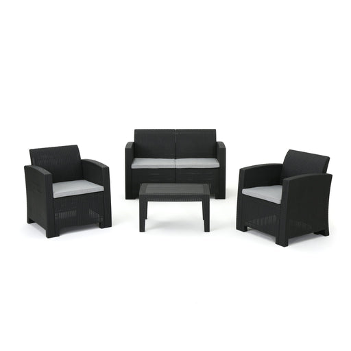Noble HouseComplete Seating for Four: This outdoor chat set includes a loveseat, coffee table, and two club chairs, providing ample seating for cozy gatherin...