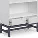- Features two adjustable shelves, one fixed shelf with 2 small drawers on a metal frame and legs.
