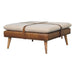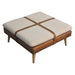 • Large Square Boucle Buffalo Hide Brown Leather Footstool - Derived from the French word for curled or ringed yarn or fabric, this handwoven upholstered furniture piece is made of 100% cotton and natural yarn, featuring buffalo hide brown leather to create a beautiful fusion of colors and materials. It has a belted strap design and also features solid wood legs with an oak-ish finish, providing both strength and durability