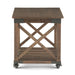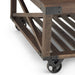 • Features spacious table top, slatted open bottom shelf, X detail on sides, unique iron wheels that offer mobility and can be easily locked into place
