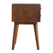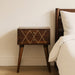 - Geo Brass Inlay Nightstand - This nightstand is endlessly versatile and will prove handy all over your home. It has been constructed from 100% solid mango wood and has a beautiful chestnut finish with wired inlay on the drawer fronts. It also features shiny knobs and 4 Scandinavian styled legs.