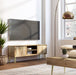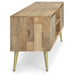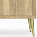 - TV Stand is perfect for TVs up to 65 inches, showcases a unique geometric brass metal inlay and four gold finished metal legs