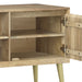 - Features two side cabinets with soft close doors and one adjustable shelf each, open central space with one shelf