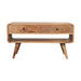 - Artisan Furniture Solid Wood Reverse Curve Oak-ish Media Unit - Introducing our reverse solid timber media unit, it is expertly constructed from 100% solid mango wood in a lovely oak-ish finish. This modern design offers clean, curved edges and features 2 drawers that come with a shiny knob, a large open slot to place any books, photo frames, or ornaments, and 4 Nordic style legs.