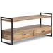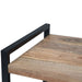 - Features two (2) large drawers, large open shelf, metal frame and drawer pulls in a black finish