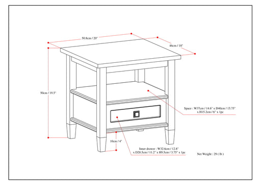 Simpli-HomeDIMENSIONS: 18" d x 20" w x 19.5" h Handcrafted with care using the finest quality solid wood Hand-finished with a Smoky Brown Stain and a protect...