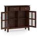 • Features two drawers for keys, gloves and other items and two tempered glass doors with interior storage and two adjustable shelves