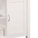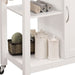 • Design and Storage: The kitchen cart features a wooden top with a sleek black finish, complemented by a white body. It includes one door with an internal shelf, one storage drawer with a center metal glide, and two open shelves for versatile storage options.