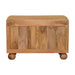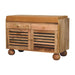 - Features: 100% solid mango wood,natural oak-ish finish,tan buffalo hide leather,cushioned seat,two drawers,double-door cabinet,sleek brass knobs,shoe rack