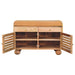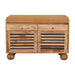 - Shoe Rack Solid Wood Shutter Oak-ish with 2 drawers Artisan Furniture - Introducing the Windsor Shoe Rack, where timeless design meets practical elegance. Handcrafted from 100% solid mango wood in a natural oak-ish finish, this piece features a comfortable tan buffalo hide leather cushioned seat, perfect for tying shoes or resting. With two drawers and a slatted double-door cabinet, it offers ample space to organize shoes and accessories while maintaining airflow. The unique round wooden feet and sleek brass knobs add a touch of sophistication, making it a stylish and functional addition to entryways, bedrooms, or living areas. The Windsor Shoe Rack combines utility and charm to elevate your home organization.